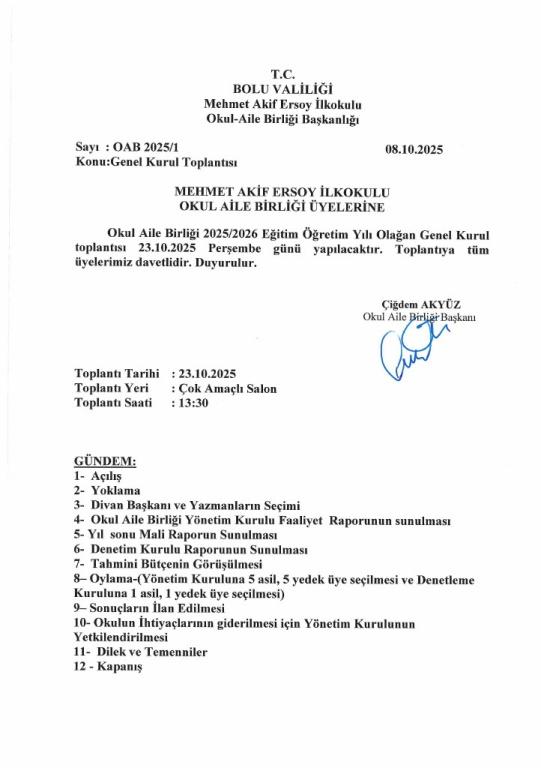 2025/2026 Eğitim-Öğretim Yılı Okul Aile Birliği Toplantısı 23.10.2025 perşembe günü saat 13.30'da okulumuz çok amaçlı salonunda yapılacaktır.